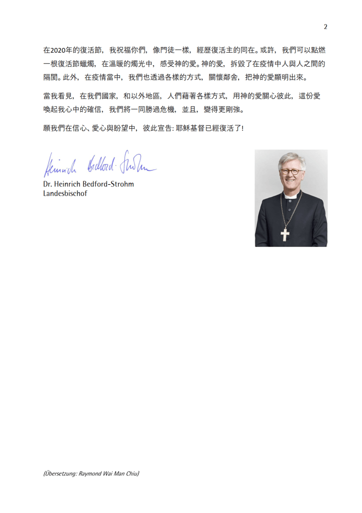 拜仁州基督教路德宗主教Dr.Heinrich Bedford-Strohm致基督徒在復活節的信