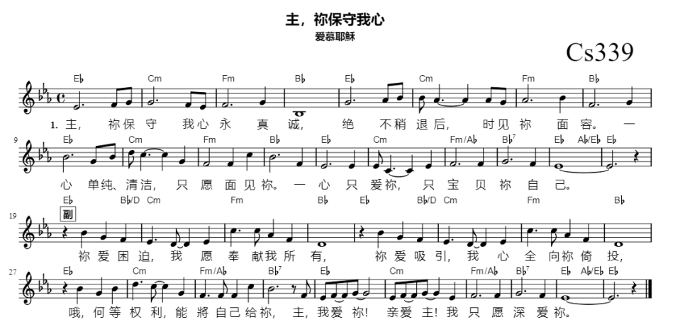 | 1 | 主,祢保守我心永真诚, 绝不稍退后,时见祢面容。 一心单纯、清洁,只愿面见祢。 一心只爱祢,只宝贝祢自己。 |